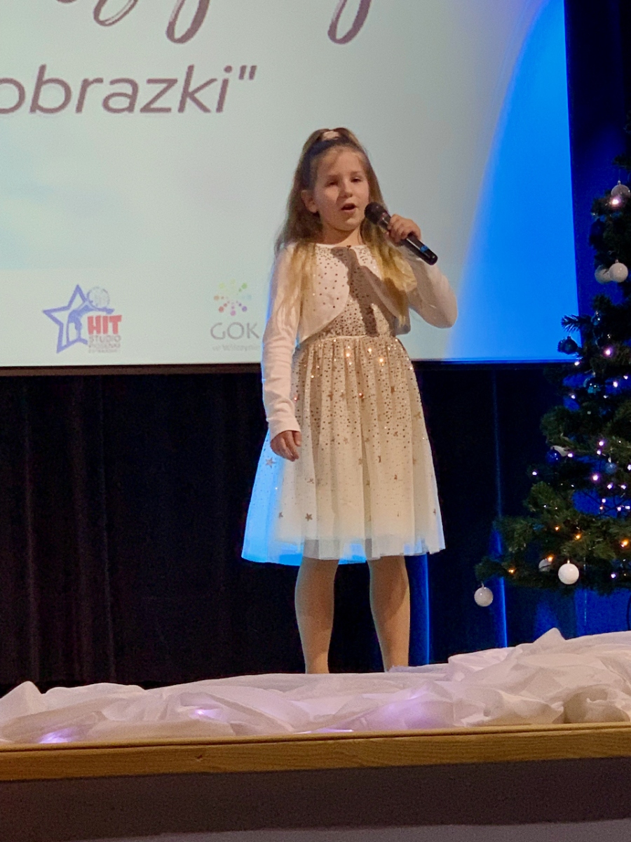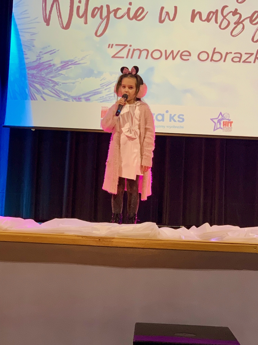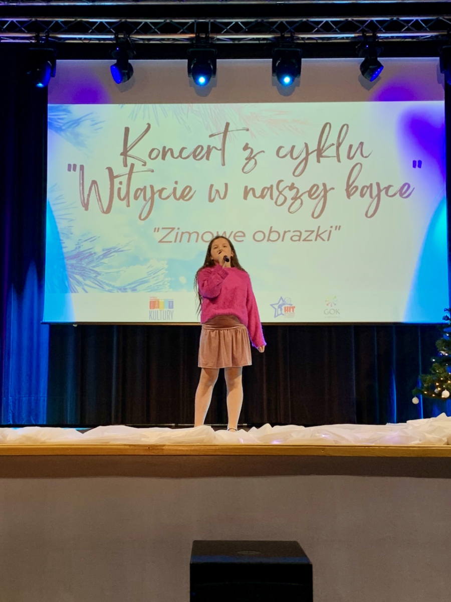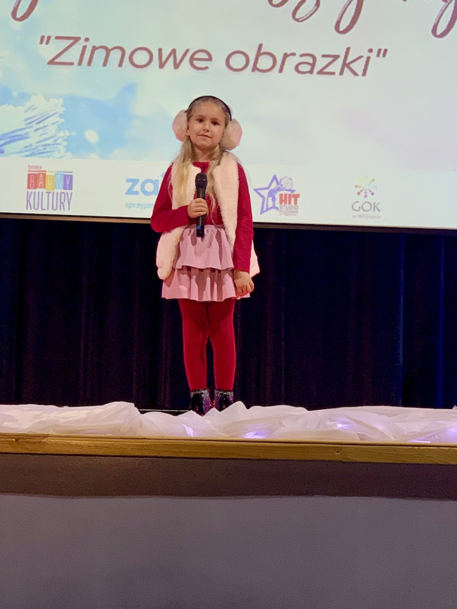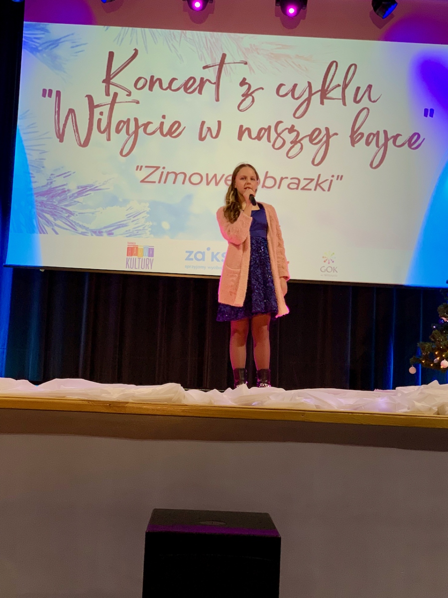 Podczas koncertu „Zimowe obrazki”, który odbył się 15 stycznia 2023r. w sali Gminnym Domu Kultury w Wilczynie publiczność usłyszała najcudowniejsze piosenki zimowe i świąteczne w wykonaniu wokalistów Studia Piosenki Estradowej HIT – Wilczyn. Instruktorką wokalistów jest Aneta Urbaniak.